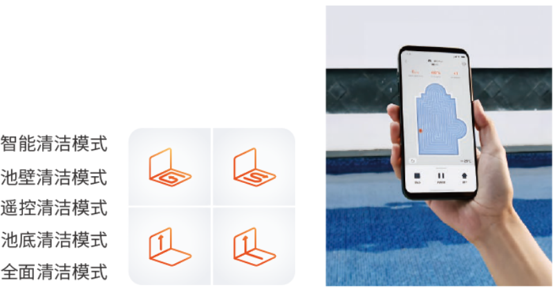 它擁有“智能清潔模式、池底清潔模式、池壁清潔模式、全面清潔模式”4種清潔模式+手動(dòng)清潔模式,滿足您的個(gè)性化清潔需求;同時(shí),通過(guò)APP智能操控,清潔地圖、清潔過(guò)程、預(yù)約時(shí)間、異常報(bào)警、清潔日志……一切盡在掌握。