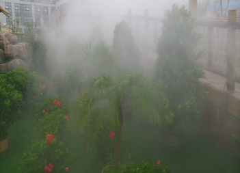 一片薄霧籠罩著鳥語花香的園區(qū)景觀