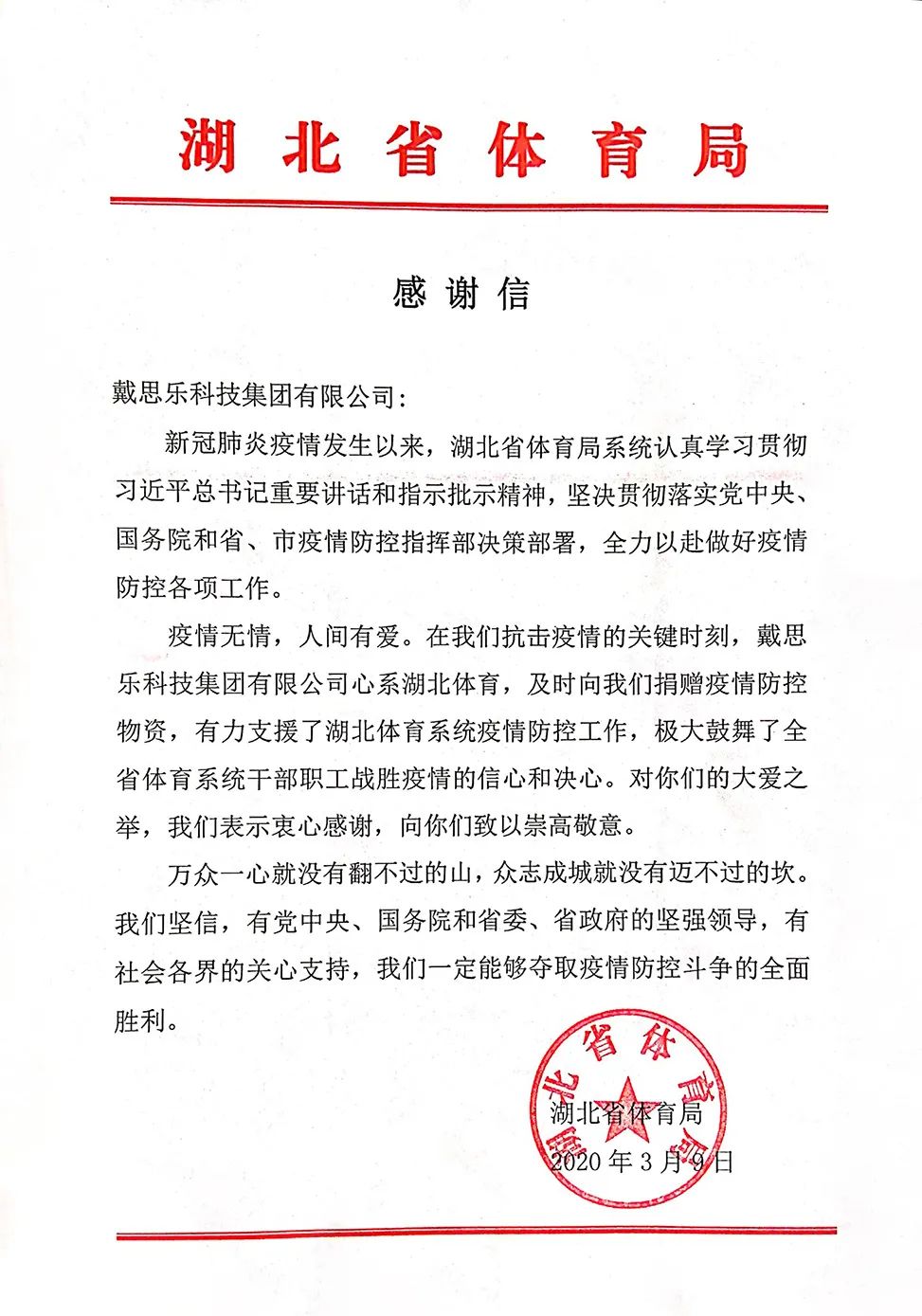 同時(shí),戴思樂(lè)集團(tuán)收到了湖北省體育局發(fā)來(lái)的感謝信。