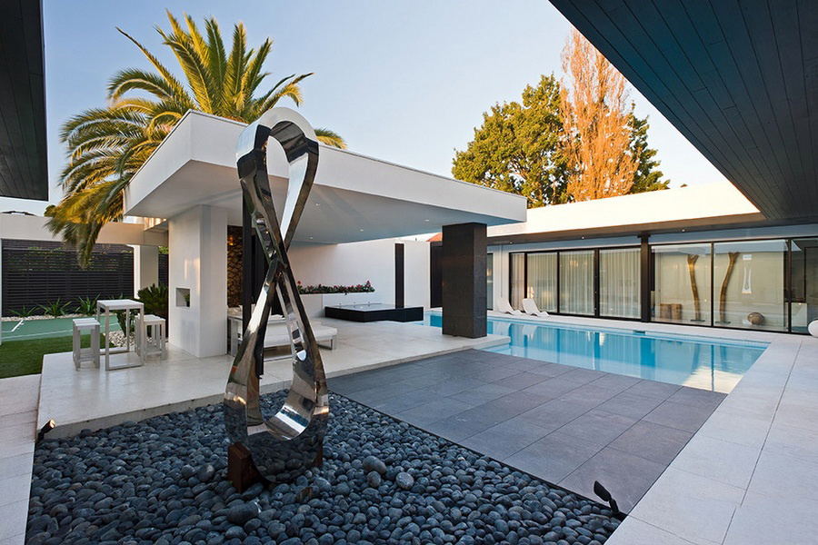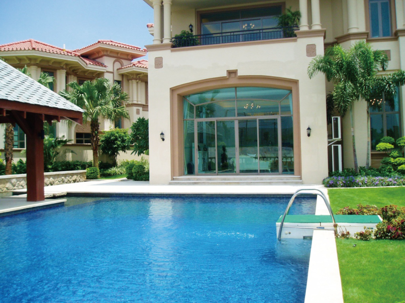 家庭別墅泳池在面積足夠的情況下,泳池的標準尺寸一般為25m*11m,水深1.6m左右,但如果純粹是家庭用,就沒有必要按照標準尺寸來設計,應就地取材,根據(jù)空間來設計!搭配植物與休閑配套產(chǎn)品,讓你的別墅增添別致品味與格調。